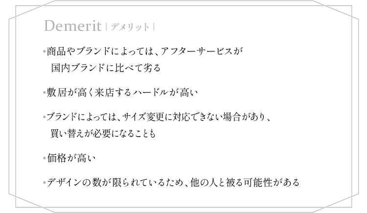 一方、既製品が多く、ブライダルリングとしてデザイン数も限られている場合が多いのでデザインの幅や自由度が低い場合があります。また、アフターサービスが国内ブランドに比べて劣る場合や、敷居が高く来店するハードルが高いため、実際に商品を見に行く機会が限られることがあります。さらに、ブランドを象徴する人気のデザインを選ぶと、他人と被る可能性も高まります。
