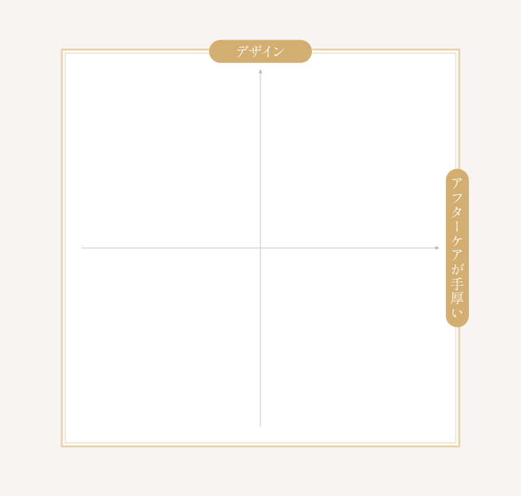 婚約指輪・結婚指輪を選ぶ際、ブランドごとの特徴を把握することは重要です。そこで、デザイン性とアフターサービスを軸に、主要な海外ハイブランドを比較した比較図をご用意しました。